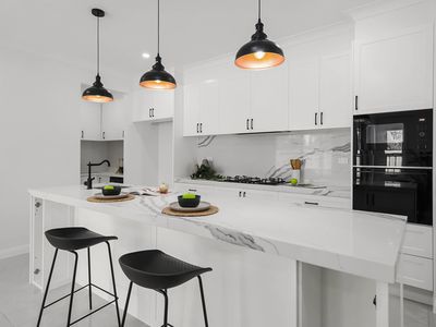 - Immaculate kitchen with 60mm calacutta stone benchtops, 900 mm appliances, splash backs, elegantly stylized range hood, huge pantry, island bench and plenty of upgraded cabinetry